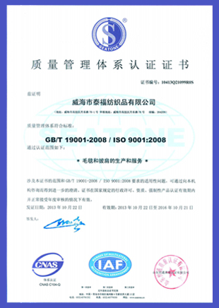 威海市泰福紡織品有限公司成立于1999年7月。公司坐落于風景秀麗、氣候宜人的海濱城市—威海。公司占地面積30000平方米,總資產6000萬元,員工150人左右。公司以毛毯、披肩、圍巾、毛呢面料的生產和銷售為主營業務,產品面向賓館、軍隊、航空、家用和酒店配套等多個領域,適應不同客戶的需求。 公司現有梳紡機械6個系列,織機、起絨機等60余套,后整理設備30多套。毛毯年生產能力80萬條。公司產品遠銷澳大利亞、新西蘭、美國、日本、韓國、馬來西亞、荷蘭、英國、意大利等國家和地區,深受用戶好評。同時公司也得到穩步提高,先后順利通過BSCI、ICS驗廠、ISO質量、環境體系認證,獲得國際羊毛局WOOLMARK標志的使用權。產品也通過了歐洲SGS檢測。2015年公司投資近千萬擴建廠房,染色、紡紗、織造、起絨、成品全流程獨自完成。 視產品質量為企業生命,把客戶要求作為我們的工作目標,公司總經理王喜成先生愿與國內外客商密切合作,共求發展。